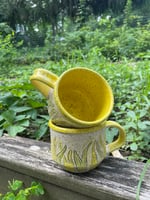 Wheel Thrown Handmade Mugs, Hand painted and carved, holds 14oz. Yellow Glazed inside, clear glazed outside. $55 each, both for $100